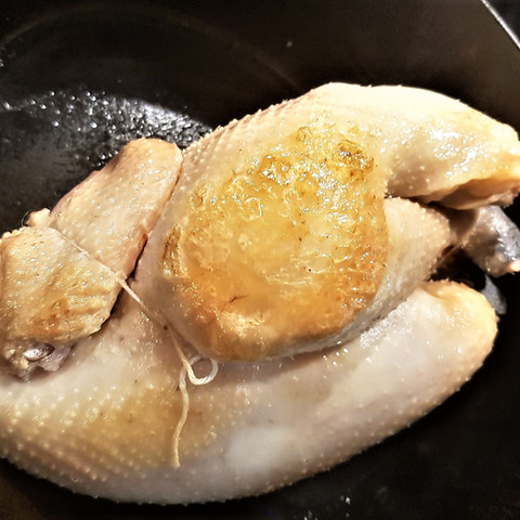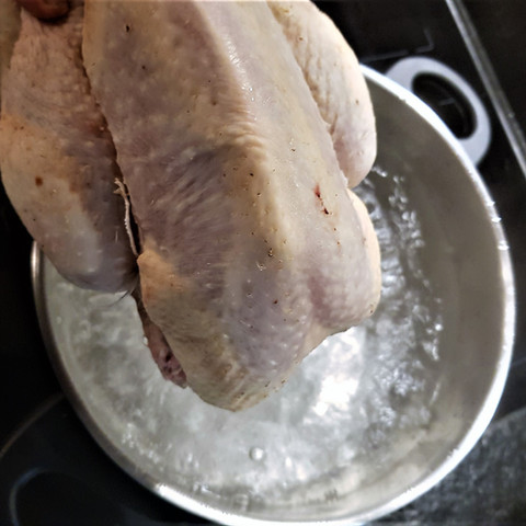 Le truc de Thierry Marx est aussi simple qu'indispensable. Il s'agit de plonger quelques secondes le poulet cru, légèrement salé à l'intérieur, dans un faitout d'eau bouillante.